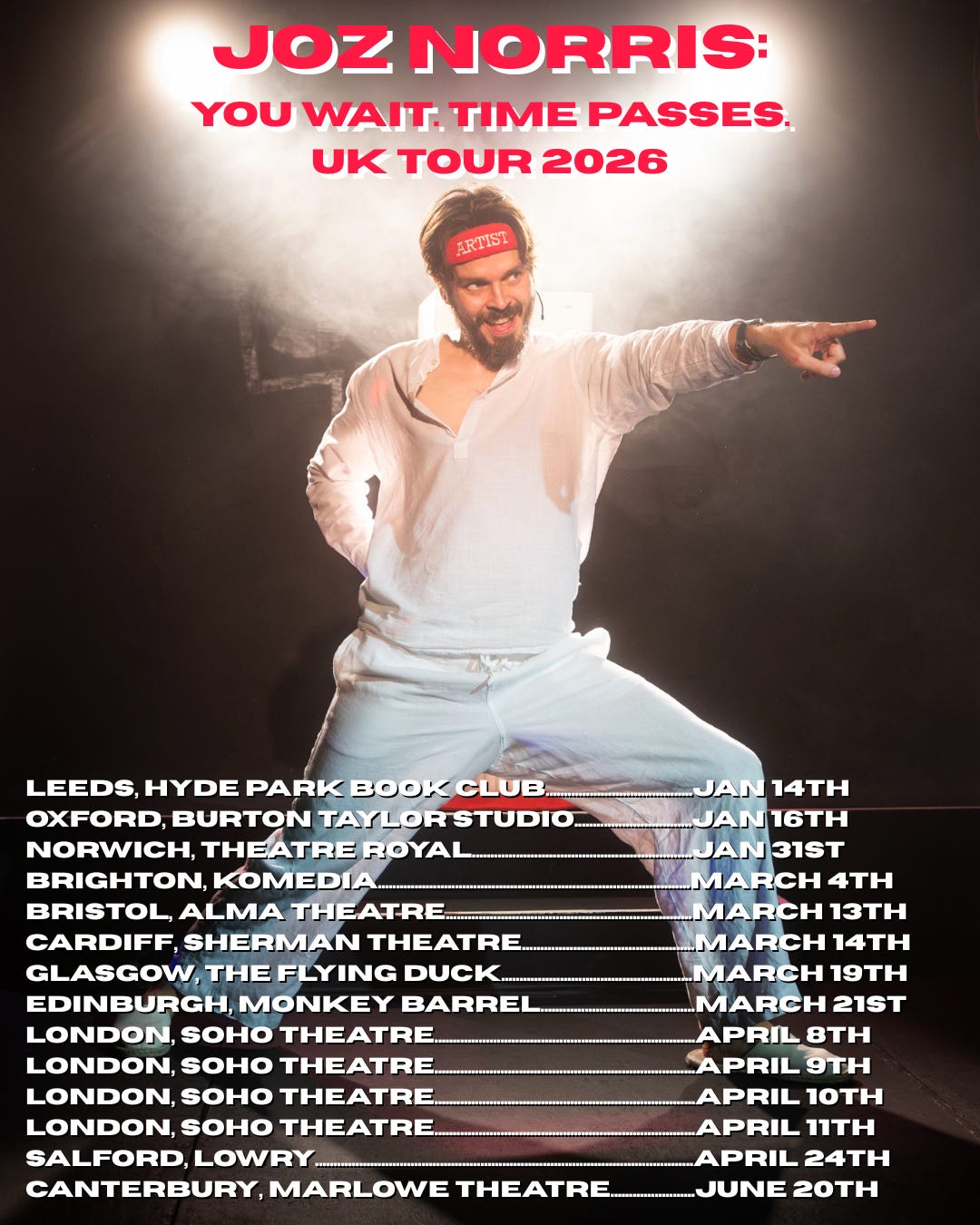 “What goes on tour?”, they say. You’ll have heard them say it. It’s one of those great imponderables. “Is the Pope a Catholic, and if so, would it be fair to call him their leader? Do bears shit in the woods, and do they enjoy it?” But the greatest of them all is the age-old “What goes on tour?” Finally, we’re able to furnish this age-old question with a real, solid answer – it’s Joz Norris. Joz Norris goes on tour. He’s doing it in 2026 with his award-winning, multi-award-nominated, 5-star critically acclaimed, sellout smash hit show You Wait. Time Passes. and you can find out more about it and book tickets here!